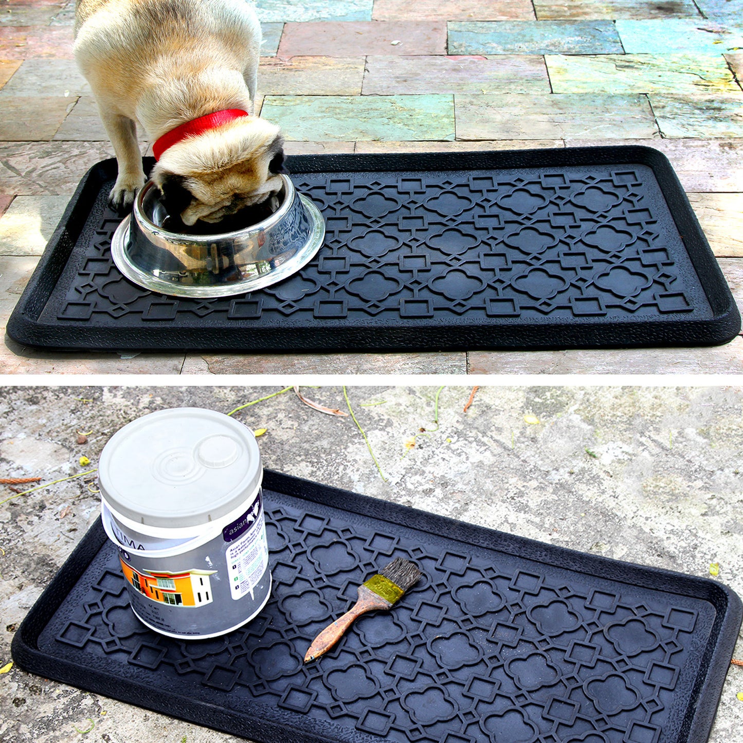 - यह 16 x 32 इंच की रबर चटाई गीले, गंदे और गंदगी से टपकने वाले जूते, फूल के बर्तन और आपके पालतू जानवर के भोजन के कटोरे को रखने के लिए आदर्श है।