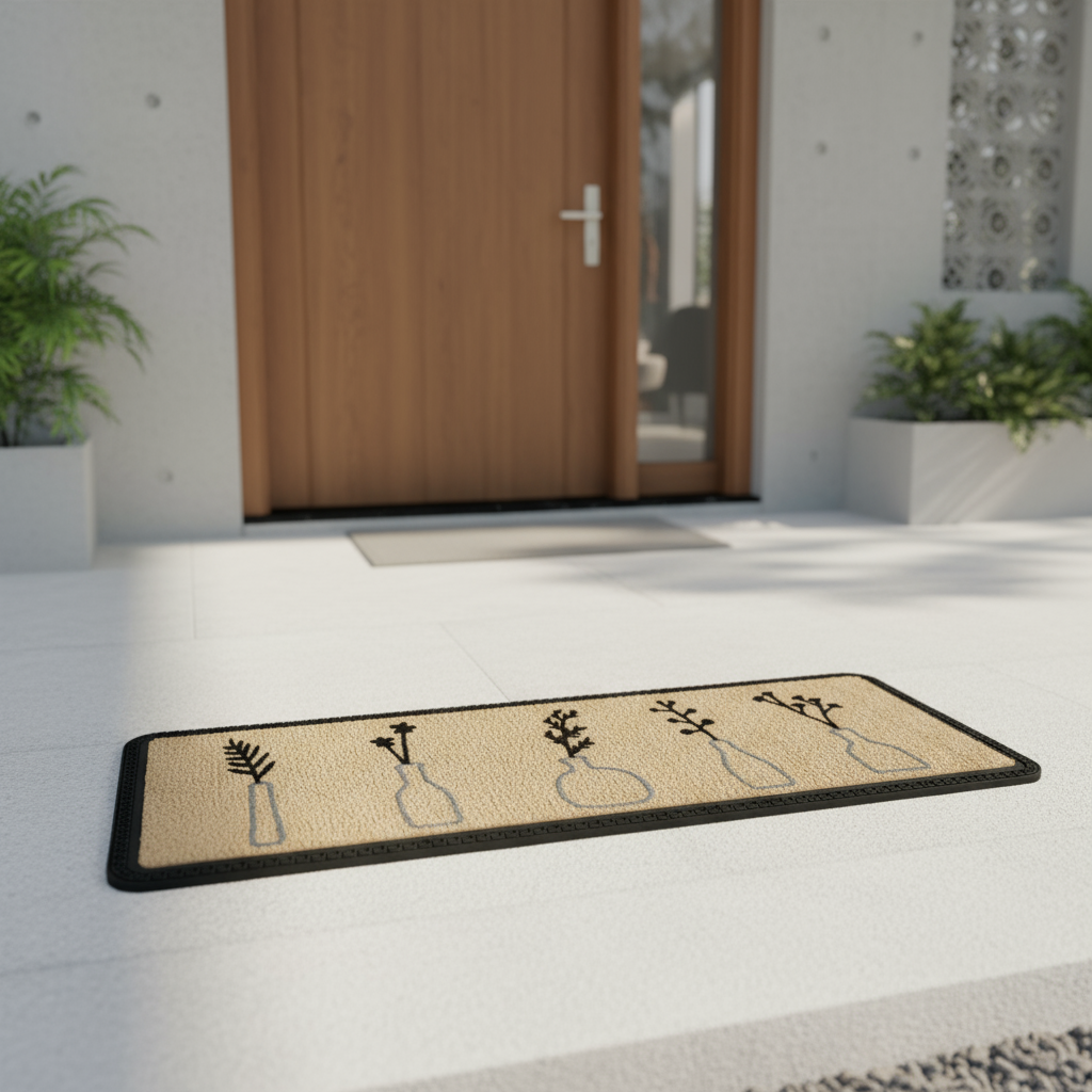 - Minimalist Design: The mat features five charming, stylised botanical stems in vases lined up across its length. The vases are outlined in a light grey/blue colour, while the stems and leaves are black, all set against a neutral tan/beige polypropylene background.